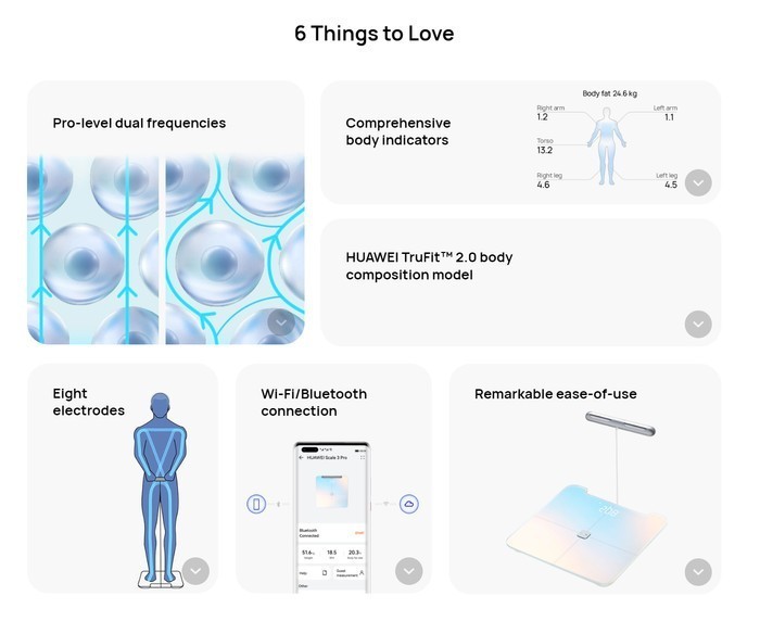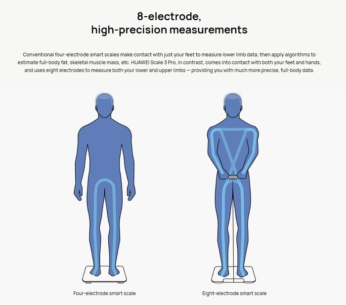 Huawei Smart Body Fat Scale 3 Pro is equipped with eight electrodes that are capable of measuring body fat to a high degree of accuracy that is comparable to what obtains on professional products such as the DEXA scan.